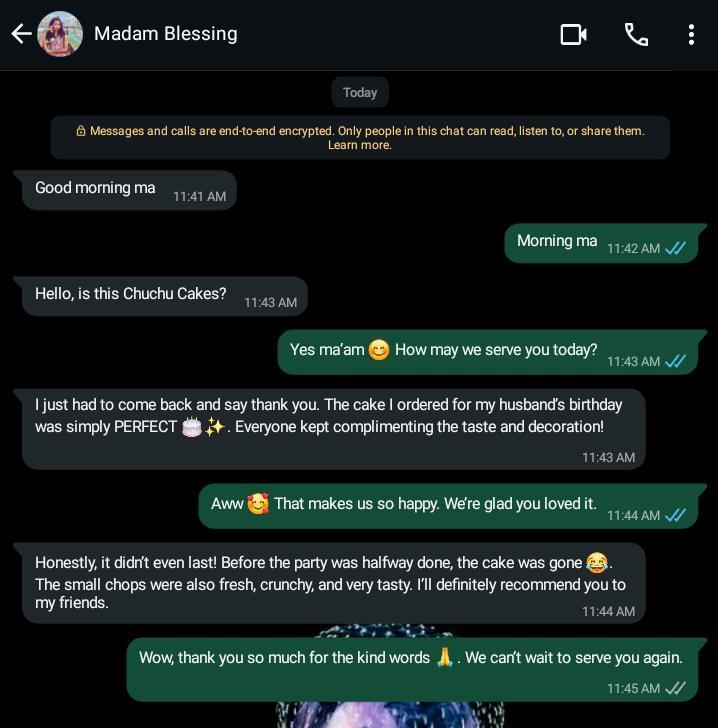 Chuchu Cakes made my daughterโs birthday unforgettable! The cake was soft, tasty, and the design was exactly what I wanted. Everyone kept asking for more